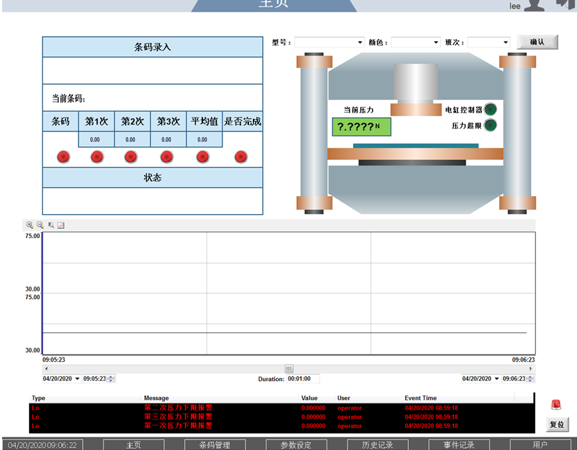 历史记录 利用条码或者时间查询压力测试数据。 可以查询该条码的车顶棚是否检测过。 输入开始时间,结束时间,点击下方的“查询”按钮,如果有记录,则占击“打印” 按钮,可以打印PDF文档。 事件记录 显示人员的操作记录